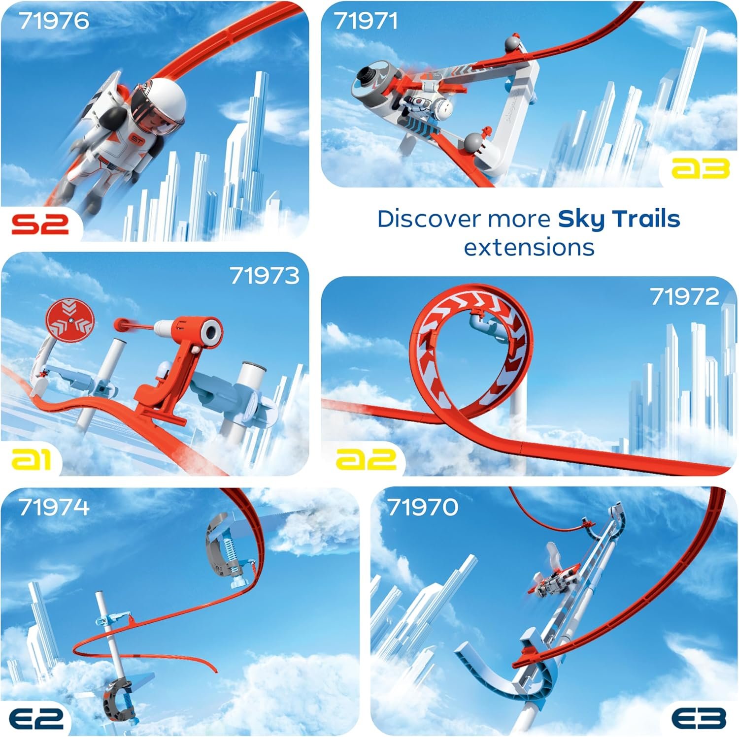 - Sky Trails de Playmobil Construction Pack (71975): según la web oficial de Playmobil, añade elementos como tubos, pilares, raíles para alargar el circuito, hacerlo más empinado o más alto.